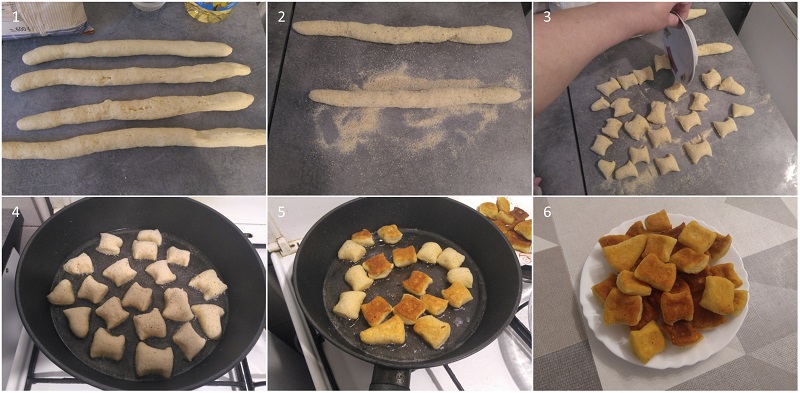 Ostatke pire-krumpira dobro izmiksati električnom mješalicom da nema grudica, dodati malo soli, jedno jaje, pola praška za pecivo, žličicu octa (da upije masnoću kod prženja, a ocat se neće osjetiti) i brašna po potrebi, tako da se može umijesiti glatko, relativno mekano tijesto. Podijeliti na manje dijelove i njih valjati u oblik zmije. Na površinu posuti mrvice i uvaljati “zmije”. Isjeći ih rubom tanjurića na željene veličine i pržiti u vrelom ulju na srednje jakoj vatri.