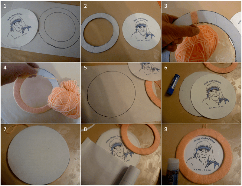Za izradu okvira potrebno je isprintati crtež Majke Tereze, izrezati u toj veličini dva kartona, od kojih jedan treba imati oblik obruča. Puni krug treba zalijepiti kao poleđinu crtežu, kako bi sve bilo dovoljno čvrsto, a oko obruča treba omotati vunu i na vrhu napraviti omču. Crtež Majke Terezije je poželjno prelijepiti samoljepljivom prozirnom folijom da se zaštiti od propadanja. Na kraju treba obruč s namotanom vunom zalijepiti za crtež tako da se dobije slika s okvirom.