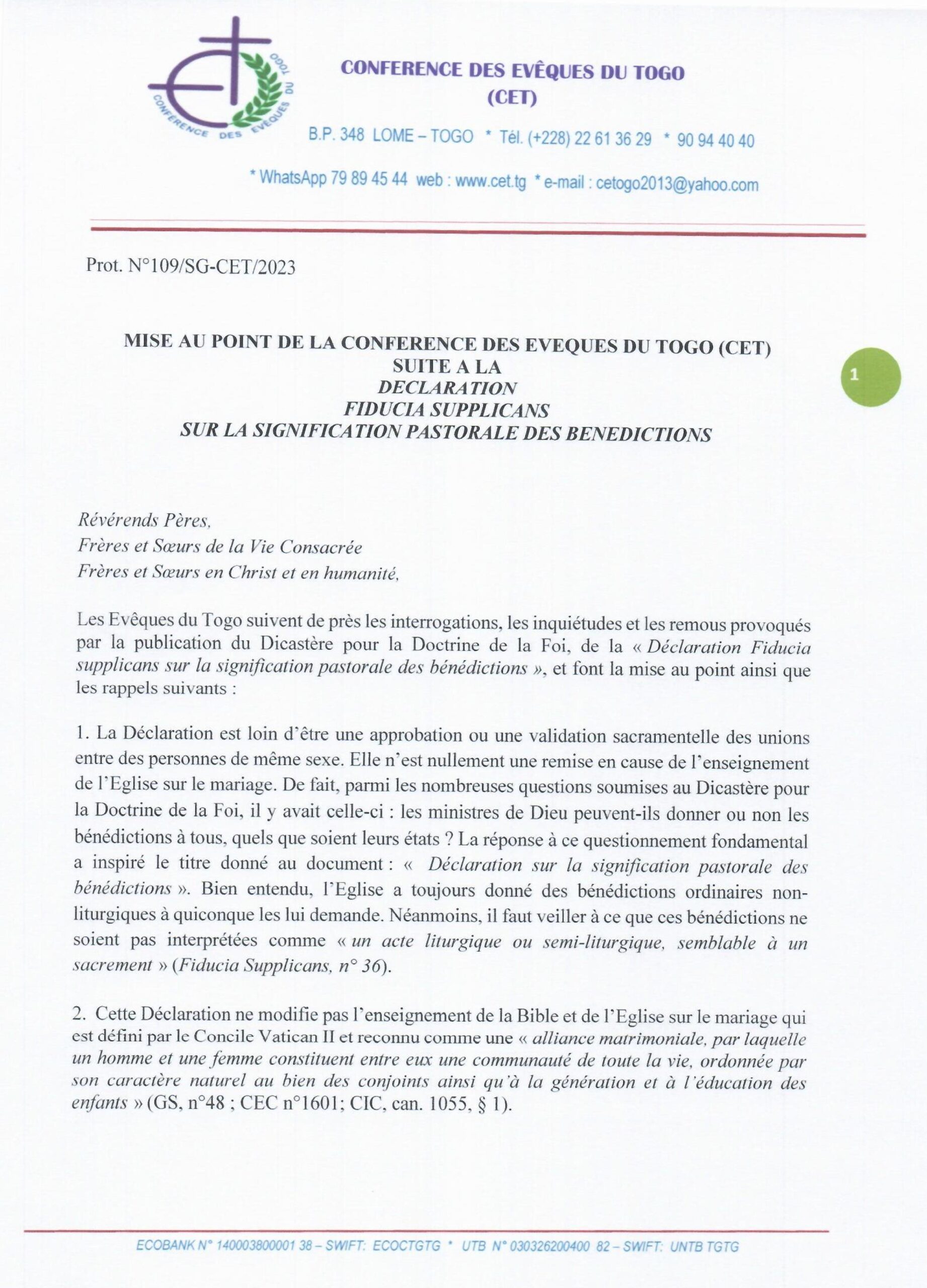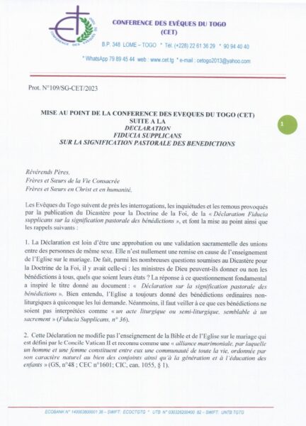 Mise au point de la Conference des Evêques du Togo (CET) suite à la Déclaration Fiducia supplicans sur la signification pastorale des bénédictions