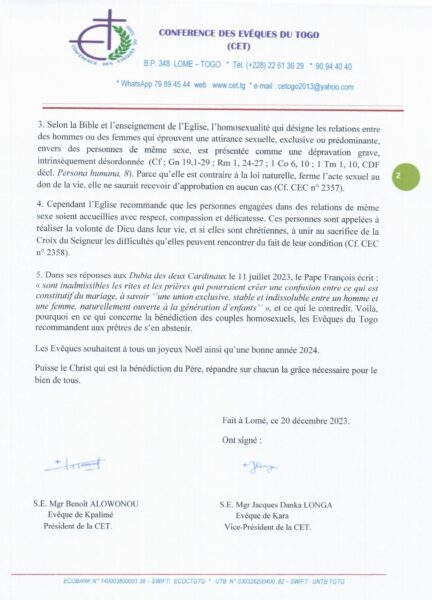 5. Dans ses réponses aux Dubia des deux Cardinaux le 11 juillet 2023, le Pape François écrit : « sont inadmissibles les rites et les prières qui pourraient créer une confusion entre ce qui est constitutif du mariage, à savoir ‘’une union exclusive, stable et indissoluble entre un homme et une femme, naturellement ouverte à la génération d’enfants’’ », et ce qui le contredit. Voilà, pourquoi en ce qui concerne la bénédiction des couples homosexuels, les Evêques du Togo recommandent aux prêtres de s’en abstenir.